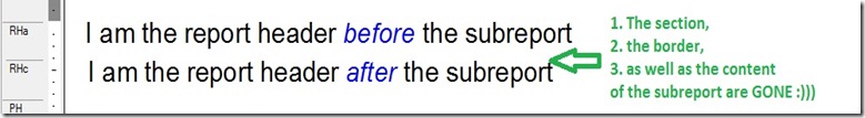 2. In Report Header a, add a Text Object and write any text that marks that you are BEFORE the subreport section.
